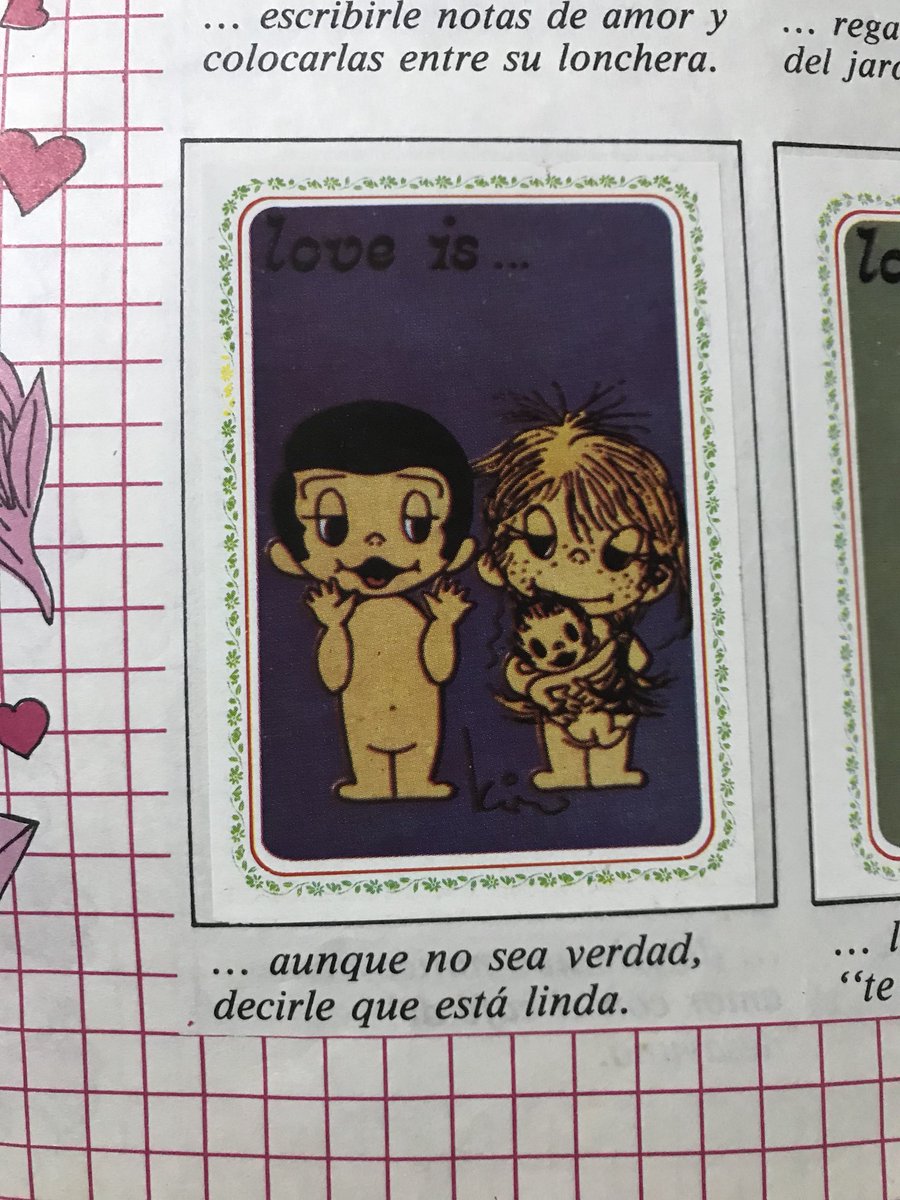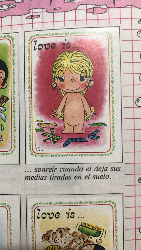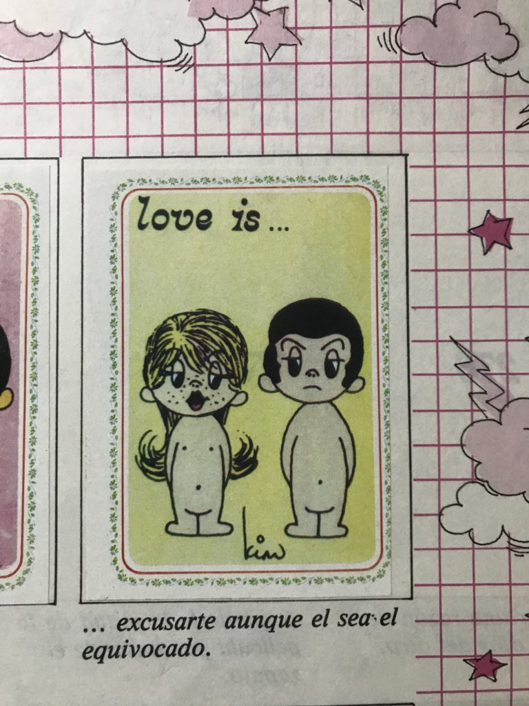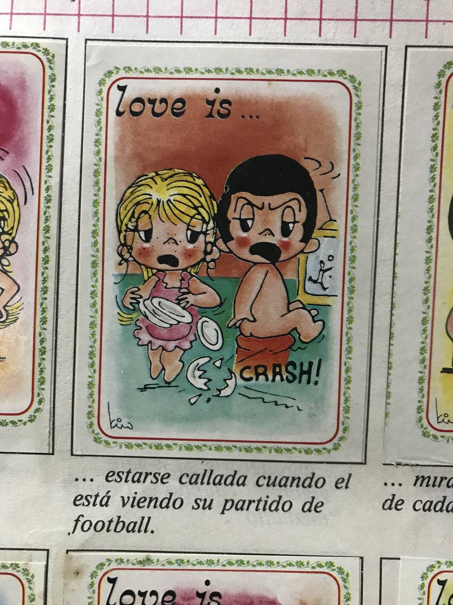 Hemos encontrado un hilo muy interesante en Twitter, en el que la usuaria Maya (@AleMayamaya) nos enseña un álbum de cromos de panini perteneciente a su madre, un álbum de 1970. Los cromos, con la introducción «Love is…» (El amor es…) hablan de como deberían ser las relaciones entre mujeres y hombres.