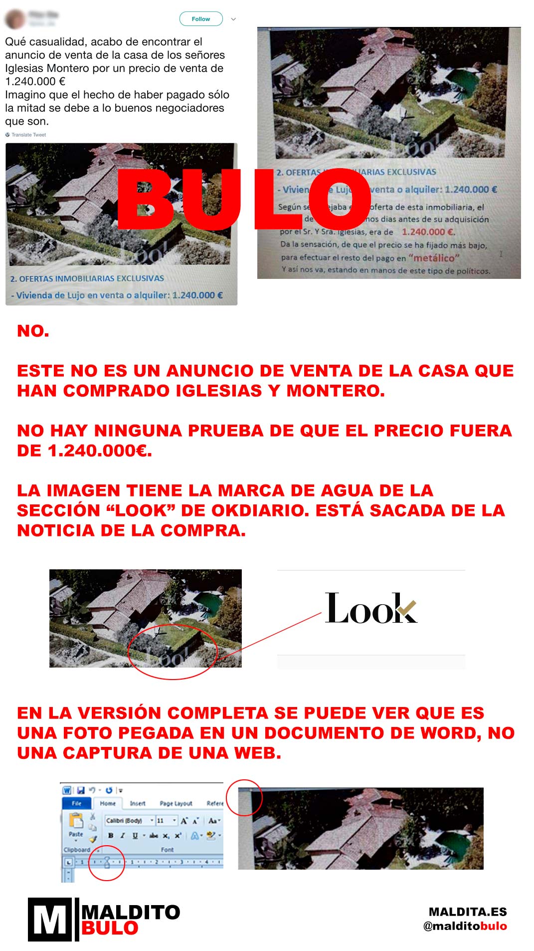 Se está extendiendo rápido, como la mecha de una dinamita, que la vivienda de Iglesias y Montero, líderes de Podemos, cuesta 1.240.000€. Es una información falsa.