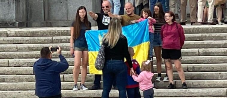 Un usuario de Twitter ha compartido una foto en la que aparece una familia de turistas ucranianos haciendo el saludo fascista delante de varios niños pequeños, una estampa que ha indignado a los tuiteros.