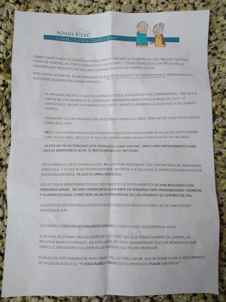 La directora antivacunas de un centro de día en Oiartzun (Gipuzkoa), Aiton-Etxe, ha querido imponer sus creencias ante la Agencia Europea del Medicamento (EMA), el Ministerio de Sanidad y el Servicio Vasco de Salud (Osakidetza) y ha enviado una circular a las familias de los usuarios en la que les informa de que «se ha decidido no administrar» la vacuna contra la COVID-19, a la que ni siquiera llama por su nombre.