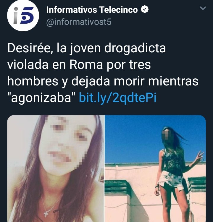 Un usuario de Twitter muestra dos titulares de noticias publicadas en Telecinco, una de ellas sobre uno de los miembros de La Manada y otra sobre una joven víctima de una violación y asesinada. La comparación es indignante: presentan al «Prenda» como un personaje mediático, disfrutando de unas vacaciones en la playa, mientras que a la víctima de violencia machista la tachan de drogadicta.