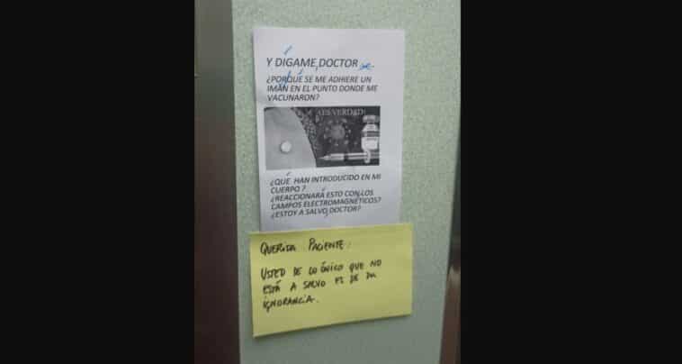 «¿Por qué se me adhiere un imán en el punto donde me vacunaron? ¿Qué han introducido en mi cuerpo? ¿Reaccionará esto con los campos electromagnéticos? ¿Estoy a salvo doctor?», pregunta el cartel.