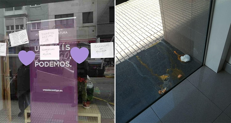 «Hoy a sede de Podemos Xixón amaneció cubierta de carteles con insultos y amenazas. Palabras como ‘corruptos’, ‘violentos’, ‘asesinos’ o ‘pederastas’ junto a expresiones como ‘España acabará con vosotros, no os quepa duda’ o ‘Podemos ilegal ya’ cubrían la cristalera», explica Alejandra Tejón Ballesteros, portavoz del grupo.