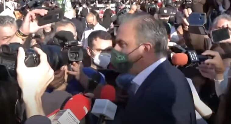 Javier Ortega Smith, secretario de VOX y portavoz en el Ayuntamiento de Madrid, llegó al mitin celebrado ayer en el barrio de Vallecas escoltado por la Policía y cargando contra los vecinos que habían acudido a protestar.