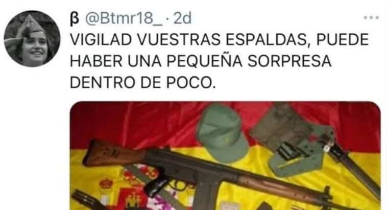 La amenaza, enviada por Twitter, consiste en una foto con armas y munición sobre una bandera de España y el siguiente texto: “Vigilad vuestras espaldas, puede haber una pequeña sorpresa dentro de poco”. Este tuit fue enviado a varias personas vinculadas con la formación.