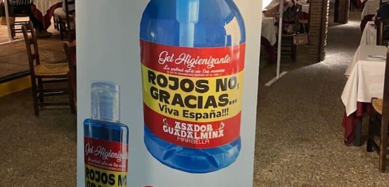 El asador Guadalmina, ubicado en Marbella, se ha hecho viral en las redes sociales por su nuevo gel higienizante, cuya etiqueta reza ‘Rojos no, gracias’.