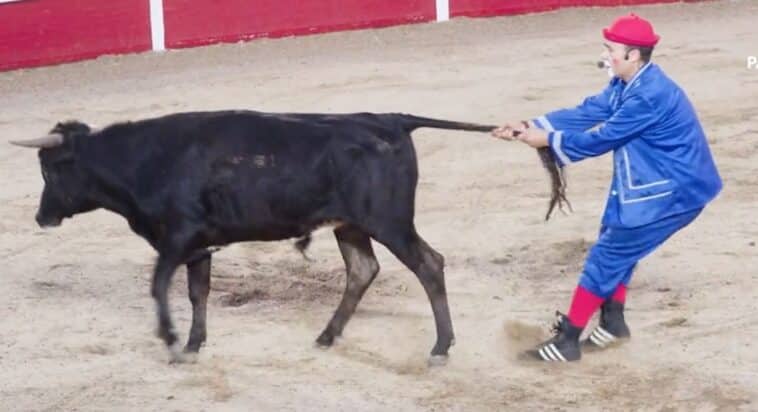 Además, se puede ver cómo varias personas con enanismo disfrazadas de payaso o haciendo black face persiguen a crías de vaca aterrorizadas, agarrándolas por los cuernos y del rabo, provocándoles caídas.