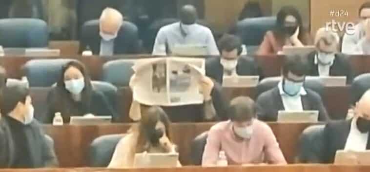 Un diputado de Más Madrid hace de espía tapándose con un periódico durante una intervención de Ayuso. El diputado Emilio Delgado incluso hizo dos agujeros para los ojos.