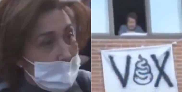 «Yo creo que hay de todo… mira, como esa ventana», aseguró la ultra, señalando una pancarta colgada en un edificio en la que se podía leer Vox, pero en lugar de una ‘o’ habían dibujado un excremento.
