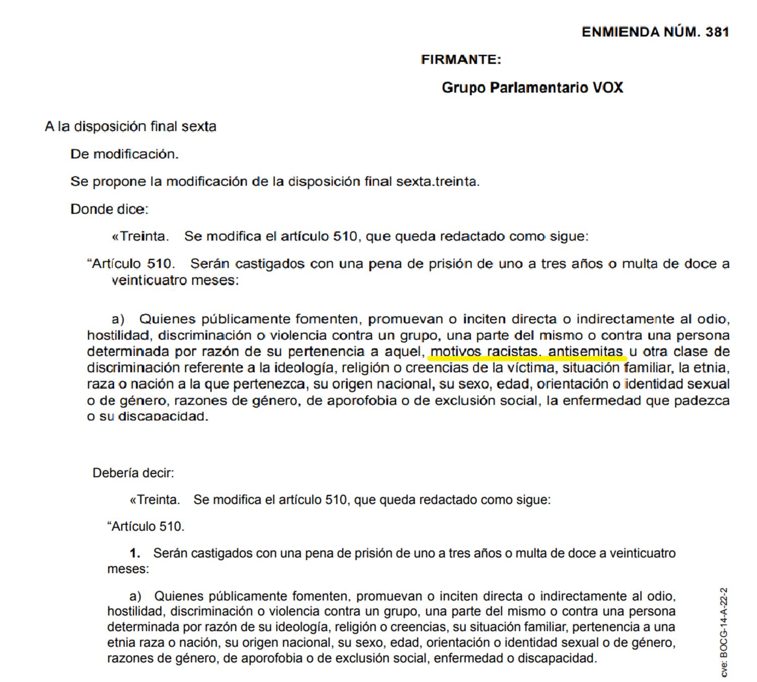 El partido ultraderechista pretende modificar la tipificación de este delito, previsto en el artículo 510 del Código Penal, manteniendo el castigo a aquellos que fomenten, promuevan o inciten al odio, la discriminación o la violencia contra un grupo o una persona por razón de su ideología, religión, etnia, raza, nación, sexo, orientación sexual, etcétera, pero eliminando las referencias expresas que la ley vigente hace a los “motivos racistas y antisemitas”.